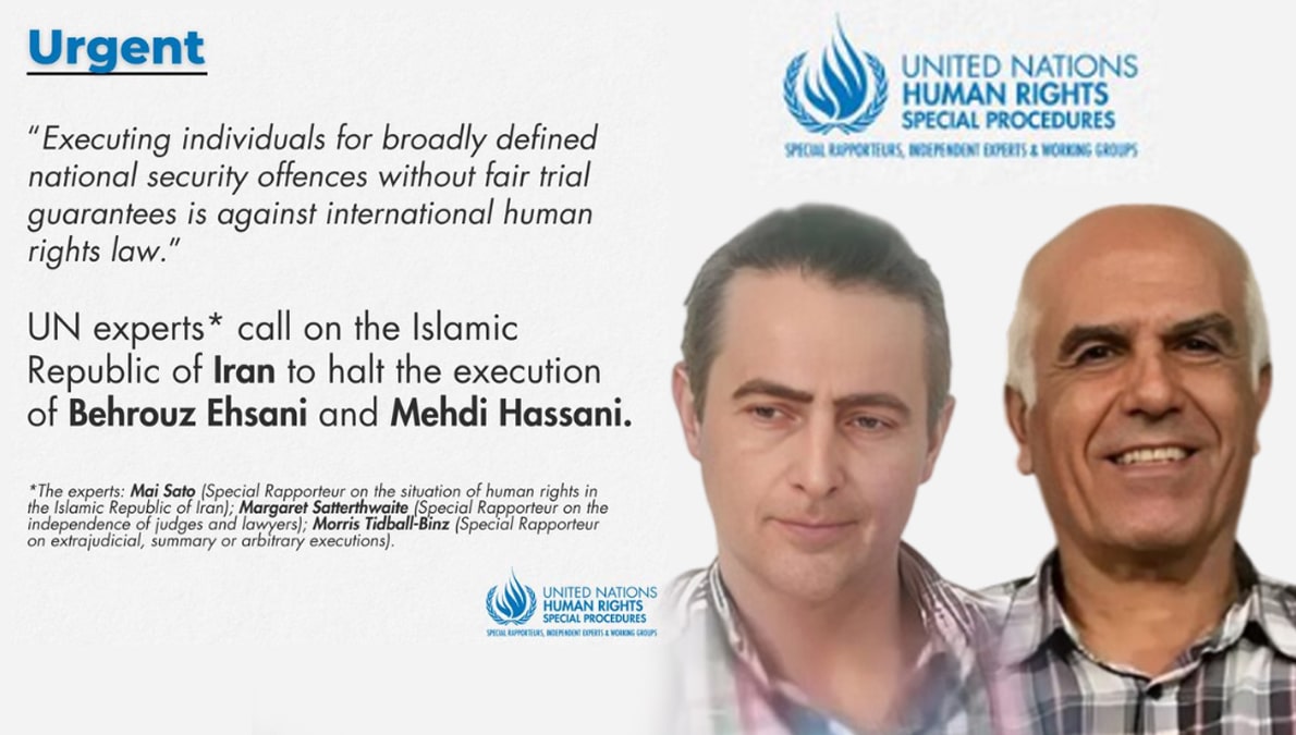 دعا خبراء الأمم المتحدة السلطات النظام الإيراني إلى وقف فوري لإعدام بهروز إحساني ومهدي حسني، بعد أن أيدت المحكمة العليا في النظام الإيراني أحكام الإعدام الصادرة بحقهما. وأثار الخبراء مخاوف بشأن عدالة محاكمتهما، حيث وردت تقارير تفيد بتعرضهما للتعذيب وانتزاع الاعترافات بالقوة.