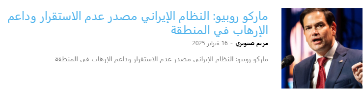 - ماركو روبيو، وزير الخارجية الأمريكي، يؤكد أن الولايات المتحدة لن تسمح للنظام الإيراني بإنشاء قاعدة عمليات في فنزويلا.