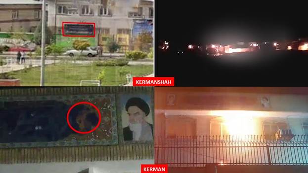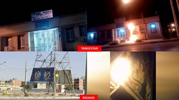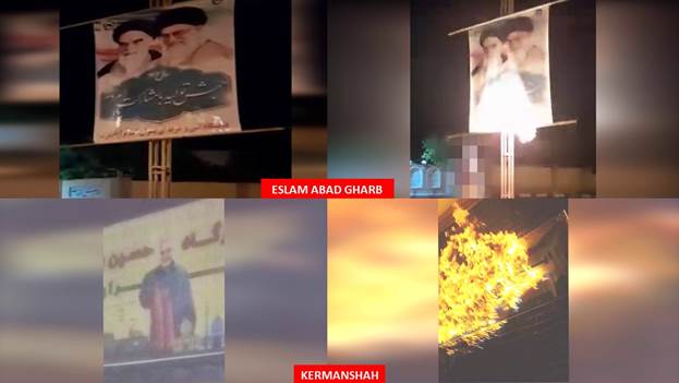 كما تم إحراق اللافتات والرموز الحكومية وصور قادة نظام الملالي، بما في ذلك صور خميني وخامنئي والجلاد قاسم سليماني، في مدن كرمانشاه، مراغه، بيرجند، ملاير، إسلامآباد غرب، أبهَر (زنجان) وسراوان.