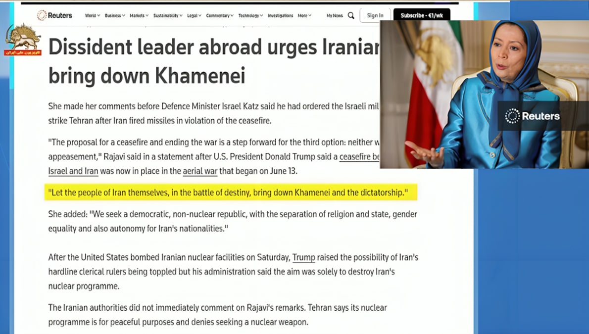 أفادت وكالة رويترز من باريس أن زعيمة المقاومة الإيرانية التي تتخذ من باريس مقراً لها، مريم رجوي، دعت يوم الثلاثاء، في أعقاب إعلان وقف إطلاق النار في الحرب الجوية بين إيران وإسرائيل، إلى ضرورة أن يقوم الشعب الإيراني الآن بإسقاط نظام الولي الفقیة للجمهورية الإسلامية، علي خامنئي.