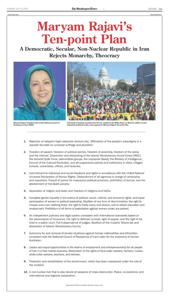 واشنطن تايمز: خطة السيدة مريم رجوي ذات النقاط العشر لمستقبل إيران