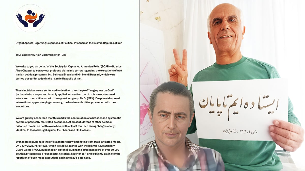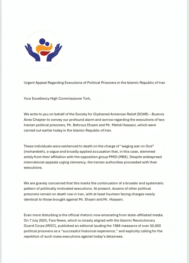 نكتب إليكم نيابة عن جمعية إغاثة الأيتام الأرمن (SOAR) – فرع بوينس آيرس، لنعرب عن قلقنا العميق وحزننا إزاء إعدام السجينين السياسيين الإيرانيين، السيد بهروز إحساني والسيد مهدي حسني، اللذين تم إعدامهما في وقت سابق اليوم في جمهورية إيران الإسلامية.