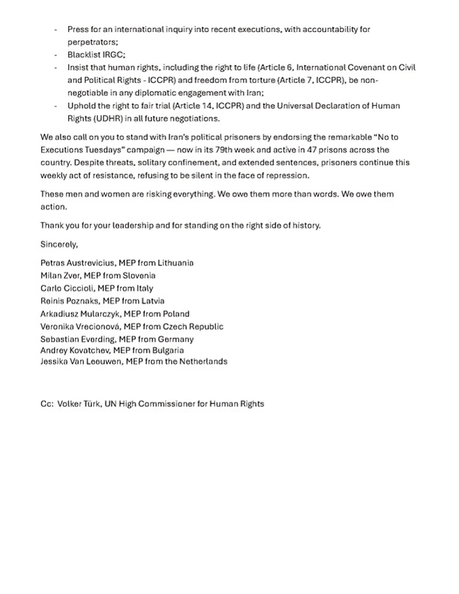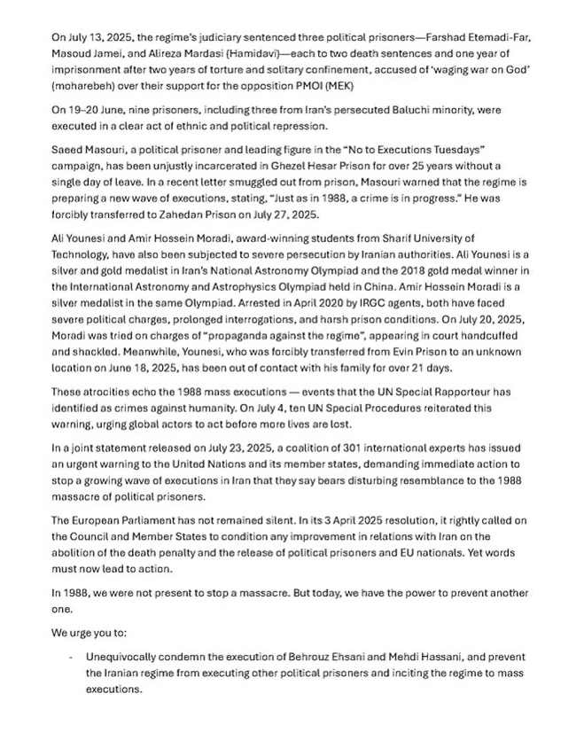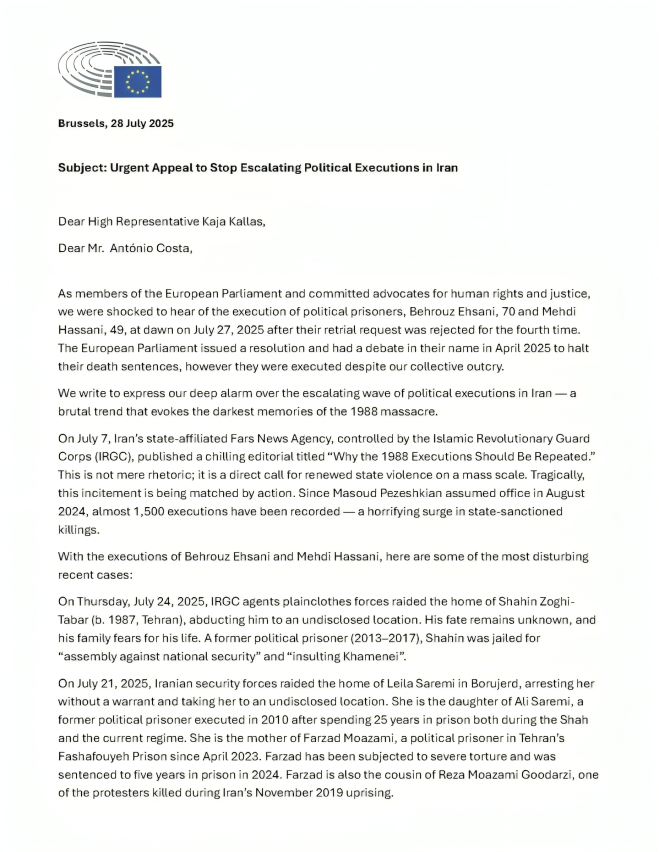 وبدأ البيان بالإشارة إلى الصدمة التي خلفها إعدام السجينين السياسيين بهروز إحساني (70 عامًا) ومهدي حسني (49 عامًا) فجر يوم 27 يوليو 2025، وذلك بعد رفض طلب إعادة محاكمتهما للمرة الرابعة. وأشار النواب إلى أن “البرلمان الأوروبي كان قد أصدر قرارًا وأجرى نقاشًا في أبريل 2025 لوقف أحكام الإعدام الصادرة بحقهما، لكنها نُفذت رغم غضبنا الجماعي”.