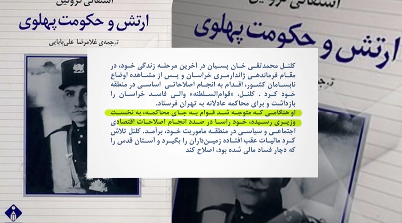 اعتقل العقيد “قوام السلطنة”، والي خراسان الفاسد، وأرسله إلى طهران لمحاكمة عادلة. لكن عندما علم أن قوام، بدلًا من محاكمته، قد أصبح رئيسًا للوزراء، بدأ بنفسه في تنفيذ إصلاحات اقتصادية واجتماعية وسياسية في منطقة مسؤوليته.