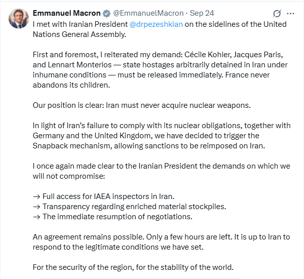 ولخص الرئيس الفرنسي محادثاته مع بزشكيان في سلسلة من النقاط الحاسمة، مؤكدًا على أن موقف فرنسا واضح وثابت: “يجب ألا تحصل إيران أبدًا على أسلحة نووية”. وأشار إلى أنه في ضوء عدم امتثال إيران لالتزاماتها النووية، قررت فرنسا، بالاشتراك مع ألمانيا والمملكة المتحدة، تفعيل آلية الزناد(Snapback)، مما يسمح بإعادة فرض العقوبات على إيران.
