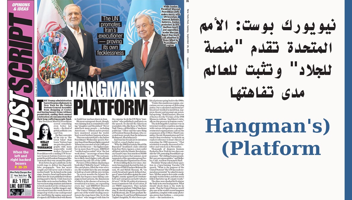 في مقال نقدي للغاية، نشرته صحيفة “نيويورك بوست” الأمريكية المرموقة في عددها الصادر يوم الأحد، الثامن والعشرين من سبتمبر عام ألفين وخمسة وعشرين، شنت الكاتبة كيلي جين تورانس (Kelly Jane Torrance) هجومًا عنيفًا على منظمة الأمم المتحدة بسبب ما وصفته بـ”الترويج لجلاد إيران” عبر توفير منصة عالمية لرئيس النظام، مسعود بزشكيان. تحت عنوان صادم هو “منصة الجلاد” (Hangman’s Platform)، يجادل المقال بأن الأمم المتحدة، من خلال الترحيب الحار بممثل نظام مسؤول عن موجة إعدامات مروعة ومنحه فرصة لالتقاط صور فوتوغرافية مبتسمة مع قادة العالم، لا تثبت فقط عدم فعاليتها وضعفها، بل تخون بشكل صارخ المبادئ التي تأسست عليها. يسلط المقال الضوء ببراعة على التناقض الحاد بين الابتسامات الدبلوماسية المصطنعة داخل أروقة الأمم المتحدة، والواقع المرير للإعدامات اليومية والصرخات المطالبة بالعدالة لآلاف المحتجين الإيرانيين الذين تجمعوا في شوارع نيويورك ليكونوا الصوت الحقيقي لشعبهم.