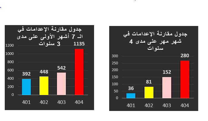 وبهذا، وصل عدد الإعدامات في الأشهر السبعة الأولى من عام 1404 (مارس-أكتوبر 2025) إلى 1135 شخصاً؛ من بينهم 36 امرأة و 6 مجرمين أحداث كانوا دون سن 18 وقت ارتكاب الجريمة المنسوبة إليهم. يمثل عدد المعدومين في الأشهر السبعة الأولى من هذا العام زيادة بنسبة 110% مقارنة بالفترة نفسها من العام الماضي (542 إعدام).
