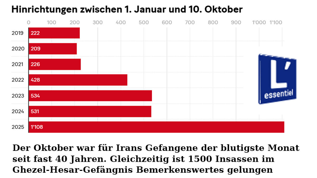 نشر موقع L’essentiel تقريراً يسلط الضوء على صراع دراماتيكي داخل سجن قزل حصار الإيراني، حيث نجح 1500 سجين في إنقاذ رفاقهم من الإعدام الوشيك. وذكر التقرير أن شهر أكتوبر كان “الشهر الأكثر دموية” لسجناء إيران منذ ما يقرب من 40 عاماً.