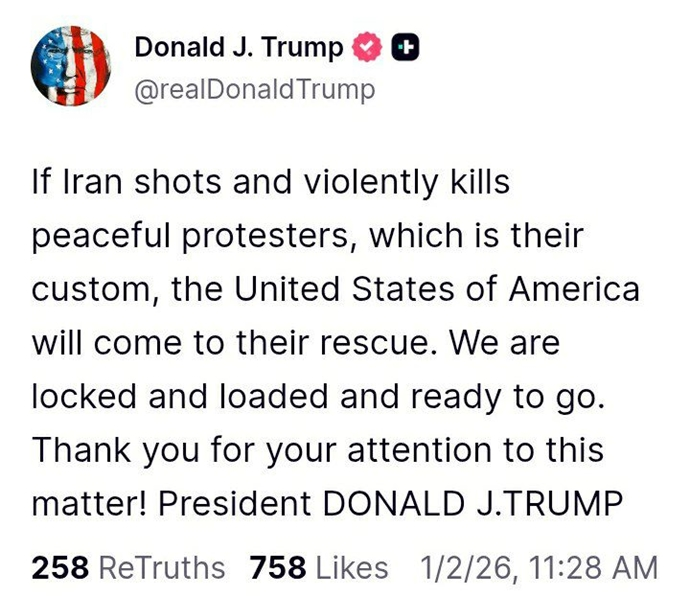 «إذا أطلقت إيران النار وقتلت المتظاهرين السلميين بعنف، وهو ما اعتادت عليه، فإن الولايات المتحدة الأمريكية ستأتي لنجدتهم. نحن في حالة جاهزية كاملة ومستعدون للتحرك. شكرًا لاهتمامكم بهذا الأمر!».