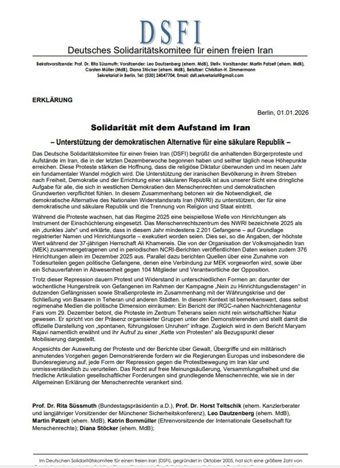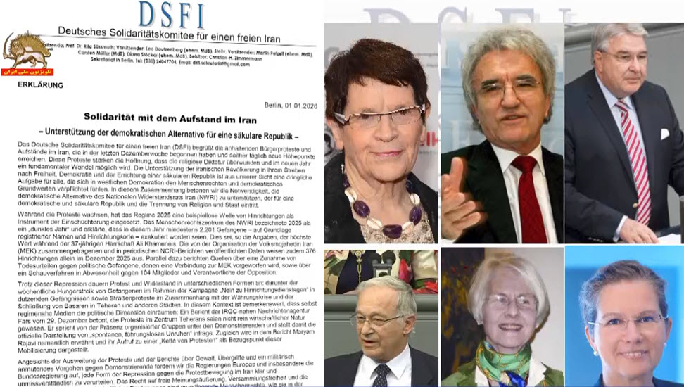 أصدرت “لجنة التضامن الألمانية من أجل إيران حرة” (DSFI) بياناً رسمياً أعلنت فيه دعمها الكامل للانتفاضة الشعبية المتصاعدة في إيران. واعتبرت اللجنة، التي تضم شخصيات سياسية ألمانية بارزة، أن الوقوف بجانب مطلب الشعب الإيراني في إسقاط الديكتاتورية الدينية وتأسيس جمهورية ديمقراطية هو “واجب فوري” على عاتق الأوروبيين، مشددة على ضرورة دعم البديل الديمقراطي المتمثل في “المجلس الوطني للمقاومة الإيرانية”.