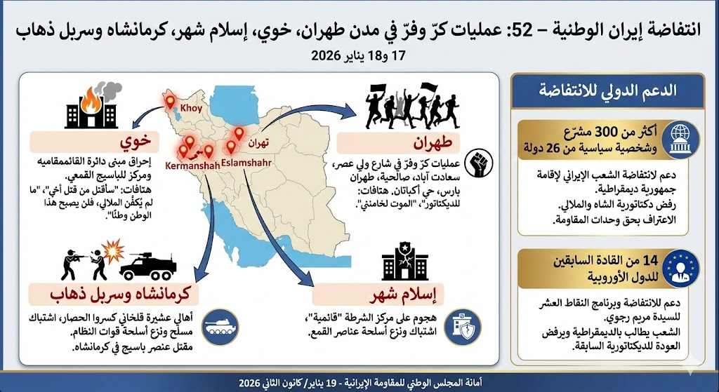 واجه الشباب الثوار، يومي السبت والأحد 17 و18 يناير 2026، قوات القمع من خلال عمليات الكرّ والفرّ في طهران ومدن أخرى. خلال هذين اليومين، شهدت مناطق مختلفة في طهران، بما في ذلك شارع ولي عصر، وسعادت آباد، وصالحية، وطهران بارس، وحي أكباتان، مشاهد الكرّ والفرّ مع ترديد هتافات مثل: “الموت للديكتاتور” و”الموت لخامنئي”.