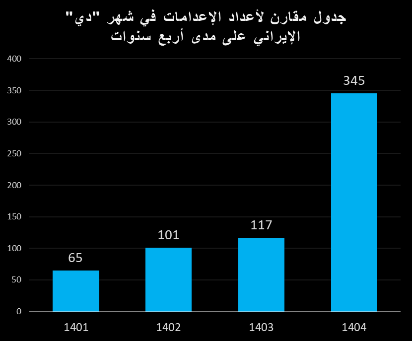 ويُظهر هذا الرقم في شهر “دي” تصاعدًا غير مسبوق؛ إذ يبلغ عدد الإعدامات في هذا الشهر نحو ثلاثة أضعاف من الشهر نفسه في عام 2025 (117 إعدامًا)، ونحو 3.5 أضعاف من الشهر نفسه في عام 2024 (101 إعدامًا)، ونحو خمسة أضعاف من الشهر نفسه في عام 2023 (65 إعدامًا).