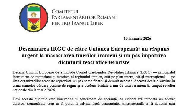 أصدرت “لجنة أصدقاء إيران الحرة في رومانيا” بياناً صحفياً شديد اللهجة، أعلنت فيه تأييدها الكامل للقرار الأوروبي القاضي بإدراج حرس النظام الإيراني في قائمة المنظمات الإرهابية. ووصف البيان قوات الحرس بأنها الأداة الرئيسية للقمع والإرهاب التي يستخدمها النظام سواء في الداخل أو الخارج.