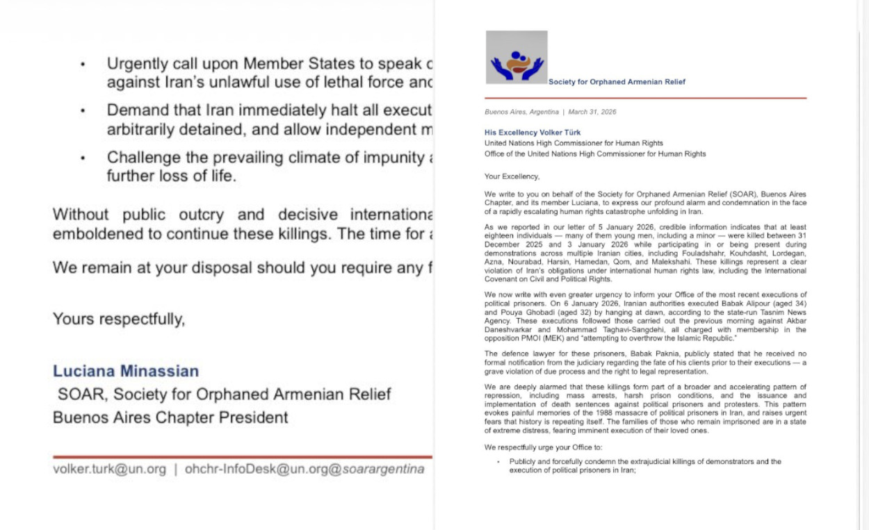 وجهت جمعية الإغاثة الأرمنية للأيتام (SOAR) فرع بوينس آيرس، رسالة رسمية إلى المفوض السامي لحقوق الإنسان في الأمم المتحدة، فولكر تورك، أعربت فيها عن قلقها البالغ وإدانتها الشديدة لتصاعد كارثة حقوق الإنسان في إيران. وأكدت الجمعية في بيانها أن تصاعد وتيرة الإعدامات واستخدام القوة المميتة ضد المتظاهرين يشكل انتهاكاً صارخاً للقانون الدولي، محذرة من استمرار نمط القمع المنهجي الذي يمارسه النظام الإيراني.