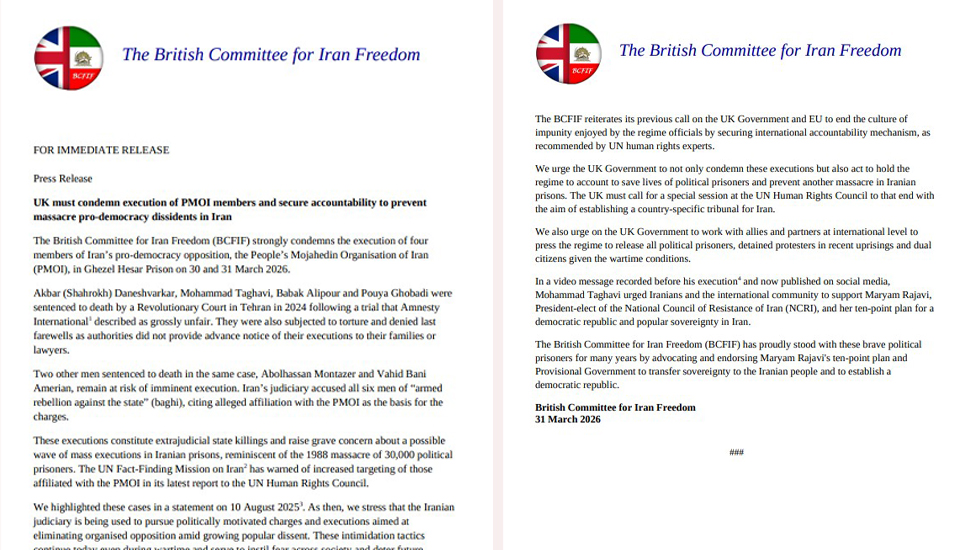 أصدرت اللجنة البريطانية من أجل إيران حرة بياناً شديد اللهجة أدانت فيه إعدام كل من محمد تقوي وأكبر دانشوركار وبابك عليبور وبويا قبادي، الذين نُفذت بحقهم أحكام الإعدام يومي 30 و31 مارس 2026.