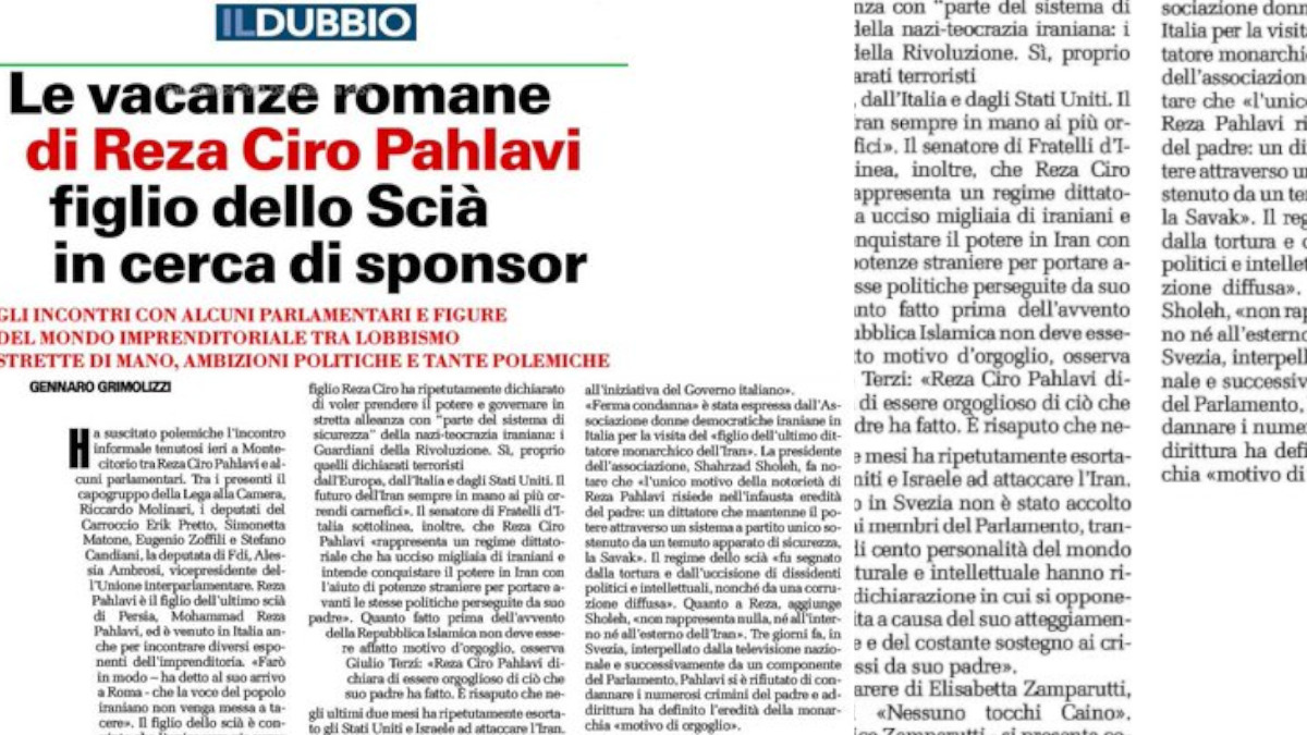 نشرت صحيفة إل دوبيو الإيطالية المرموقة تقريراً يسلط الضوء على الزيارة المثيرة للجدل التي قام بها رضا بهلوي، ابن الشاه المخلوع، إلى العاصمة روما بحثاً عن رعاة وداعمين سياسيين. وأشار التقرير إلى أن لقاءاته غير الرسمية مع بعض البرلمانيين وشخصيات من عالم الأعمال أثارت موجة من الانتقادات الواسعة، حيث طغت السجالات السياسية على محاولاته الترويج لنفسه.