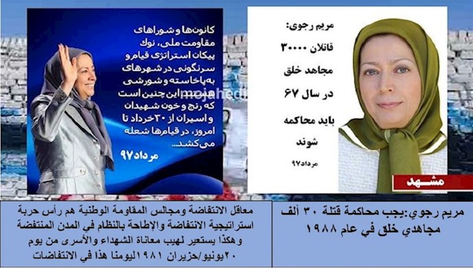 في الذكرى السنوية لجريمة ارتكبها خميني ونظام ولاية الفقيه تم خلالها إبادة 30 ألف سجين سياسي، خلدت معاقل الانتفاضة في مختلف المدن الإيرانية ذكرى هؤلاء الأبطال ممن أعدمهم النظام الإيراني. إن تجديد العهد مع أبطال مجزرة عام 1988 في الذكرى الثلاثين لاستشهادهم وإحياء مشاعل المقاومة وتضحية الشعب ضد نظام الإرهاب الحاكم باسم الدين في إيران هو مشعل لآلاف أشرف ومعاقل الانتفاضة في جميع أنحاء الوطن الأسير الذي يبشّر بالإطاحة بنظام ولاية الفقيه برمته. كما قالت «مريم رجوي» إن الإطاحة بالنظام يحتاج إلى معاقل الانتفاضة وجيش التحريرالوطني الإيراني.